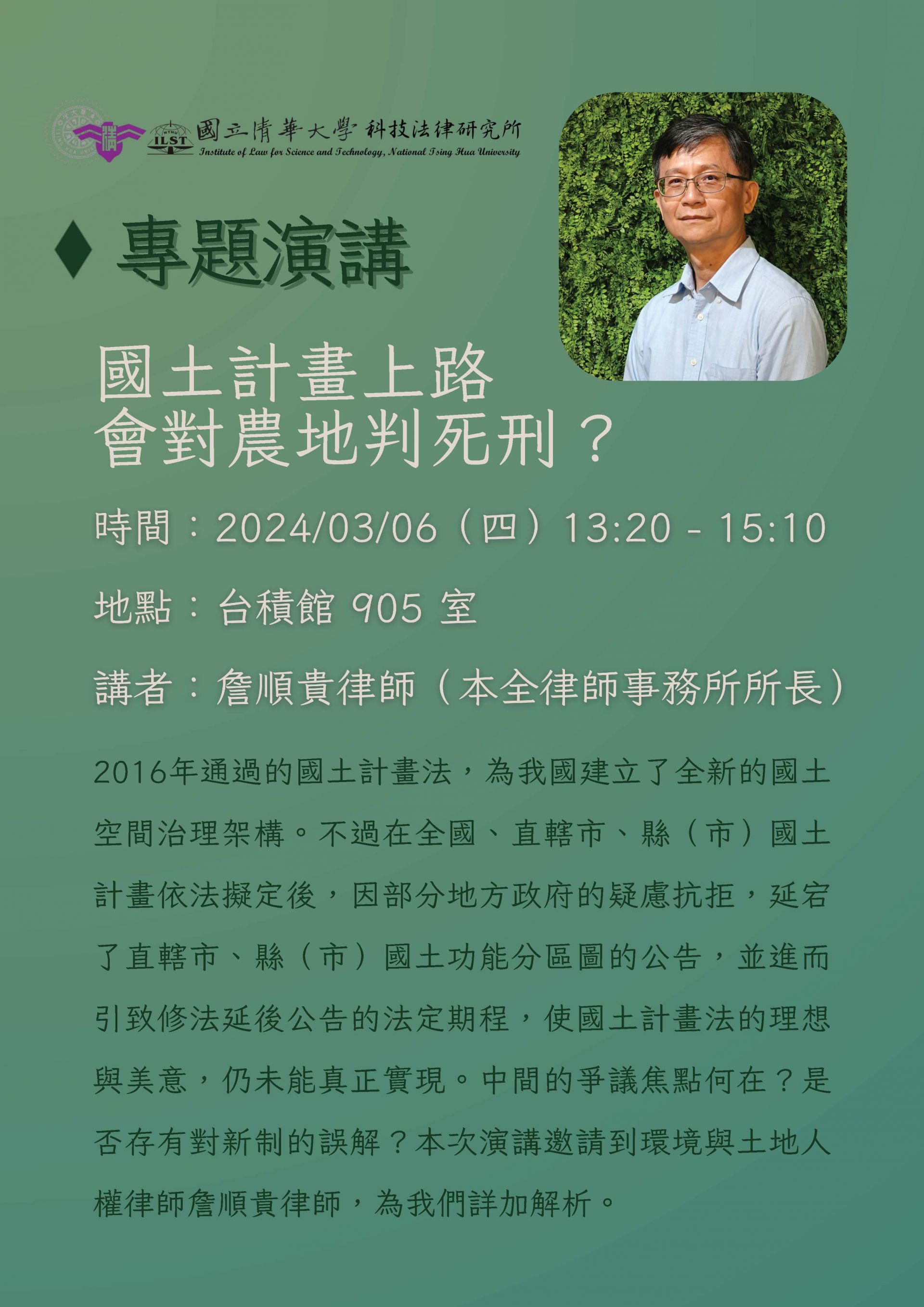 講者介紹: 2016年通過的國土計畫法,為我國建立了全新的國土空間治理架構。不過在全國、直轄市、縣(市)國土計畫依法擬定後,因部分地方政府的疑慮抗拒,延宕了直轄市、縣(市)國土功能分區圖的公告,並進而引致修法延後公告的法定期程,使國土計畫法的理想與美意,仍未能真正實現。中間的爭議焦點何在?是否存有對新制的誤解?本次演講邀請到環境與土地人權律師詹順貴律師,為我們詳加解析。