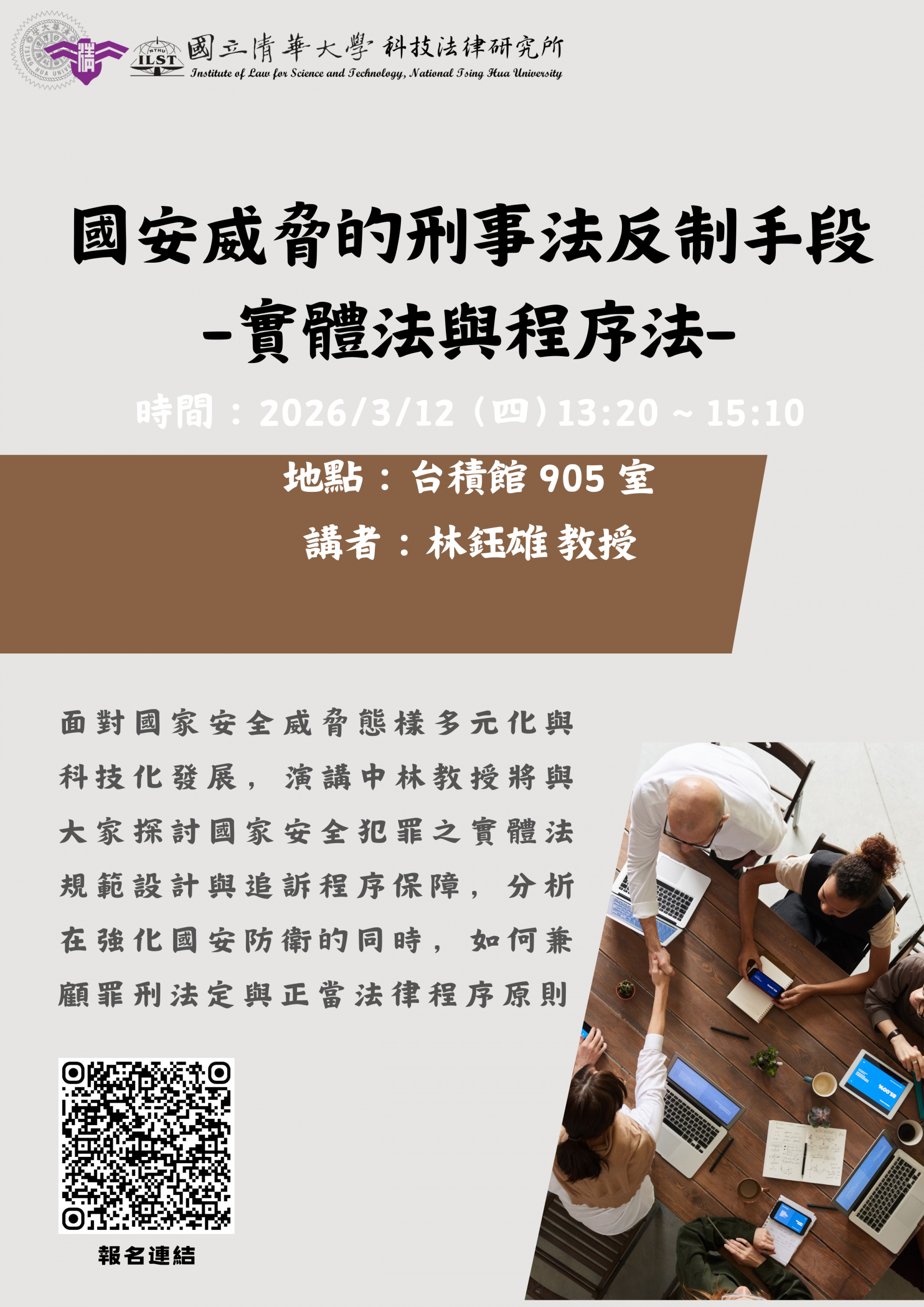 林鈺雄教授為國立臺灣大學法律學院專任教授,長期專研刑事實體法、訴訟法及比較刑事法制,學養深厚、論述精闢,為我國刑事法學巨擘。近年來,面對國家安全威脅態樣多元化與科技化發展,林教授持續關注國安犯罪之規範建構與程序保障問題,本次演講「國安威脅的刑事法反制手段—實體法與程序法—」,將探討國家安全犯罪之實體法規範設計與追訴程序保障,分析在強化國安防衛的同時,如何兼顧罪刑法定與正當法律程序原則。相信透過林教授兼具學理深度與實務視野的精闢分析,將為聽眾提供完整而周延的思考框架,深化對國安威脅與刑事法回應機制之理解,歡迎師生踴躍參與!