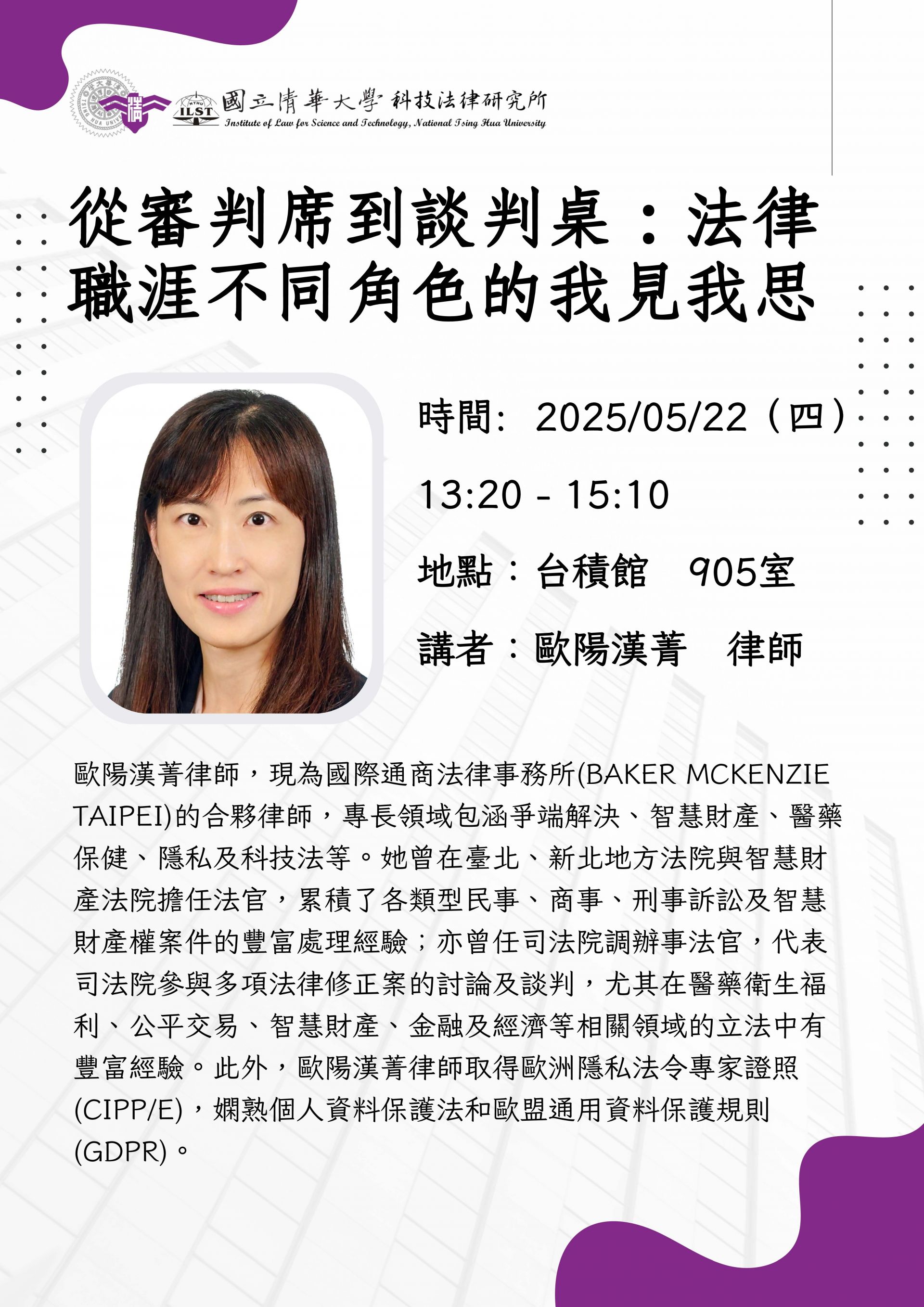 講者介紹:歐陽漢菁律師,現為國際通商法律事務所(Baker McKenzie Taipei)的合夥律師,專長領域包涵爭端解決、智慧財產、醫藥保健、隱私及科技法等。她曾在臺北、新北地方法院與智慧財產法院擔任法官,累積了各類型民事、商事、刑事訴訟及智慧財產權案件的豐富處理經驗;亦曾任司法院調辦事法官,代表司法院參與多項法律修正案的討論及談判,尤其在醫藥衛生福利、公平交易、智慧財產、金融及經濟等相關領域的立法中有豐富經驗。此外,歐陽漢菁律師取得歐洲隱私法令專家證照(CIPP/E),嫻熟個人資料保護法和歐盟通用資料保護規則(GDPR)。