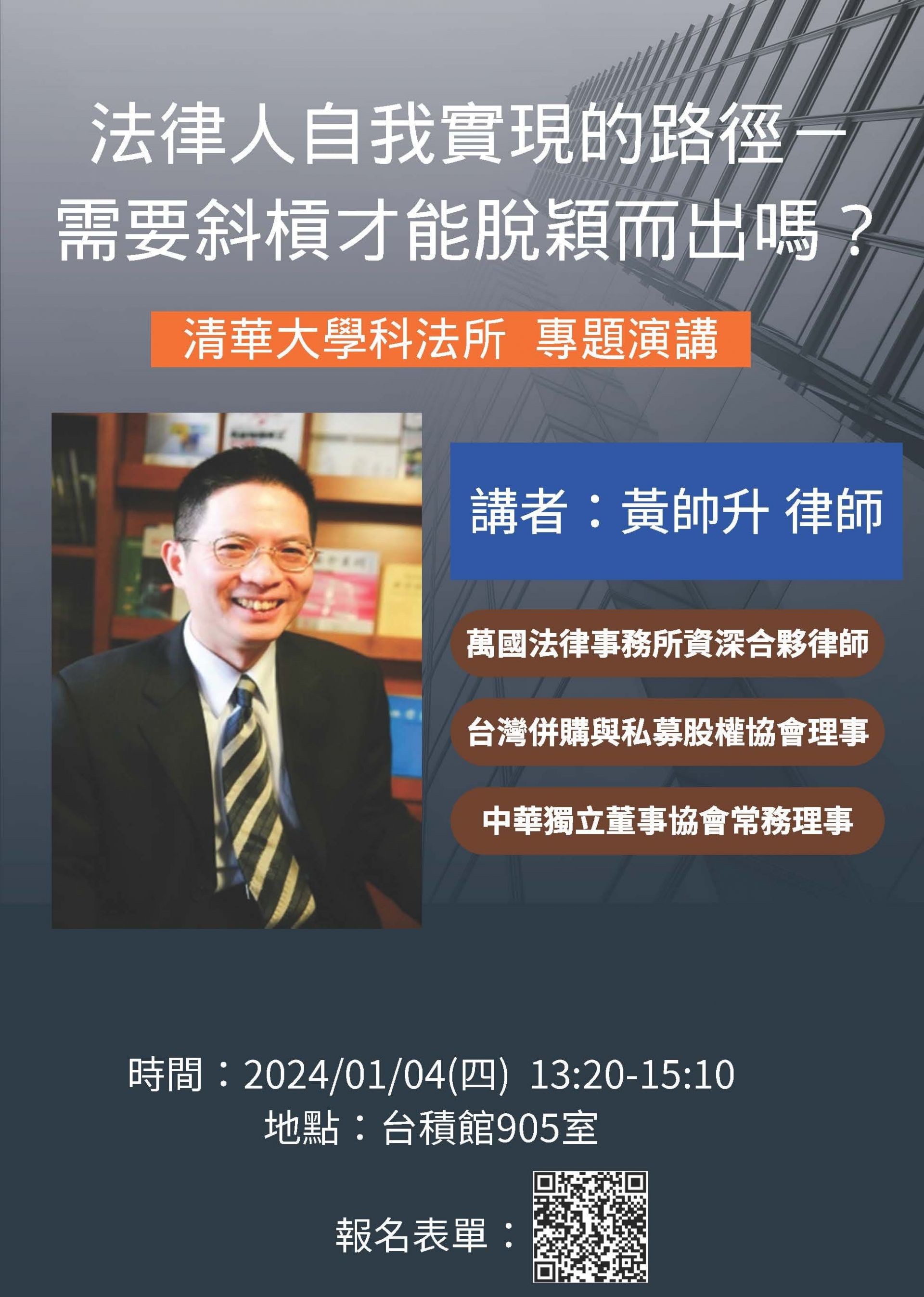 黃帥升律師團隊從2005年開始迄今處理近40件經營權爭議案件,也被英國IFLR1000雜誌評選為2020年最佳銀行法、專案融資、資本市場及併購法律師,更於2019年至2023年被Asia Business Law Journal 評選為「台灣 Top 100 律師」,萬國法律事務所也定期會提供當代法律雜誌文章供科法所同學閱讀,這次演講也期待講者可以分享其專業知識,為莘莘學子指引學習法律的道路!