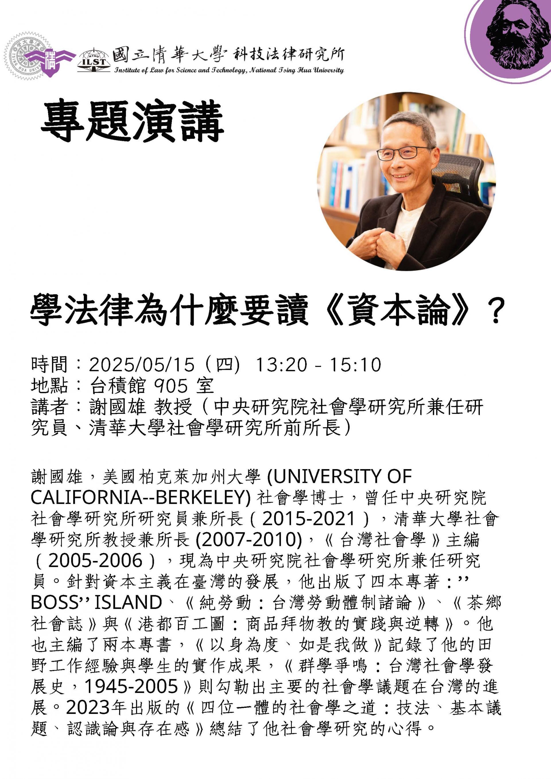 【專題演講】 中央研究院社會學研究所兼任研究員謝國雄教授—學法律為什麼要讀《資本論》?