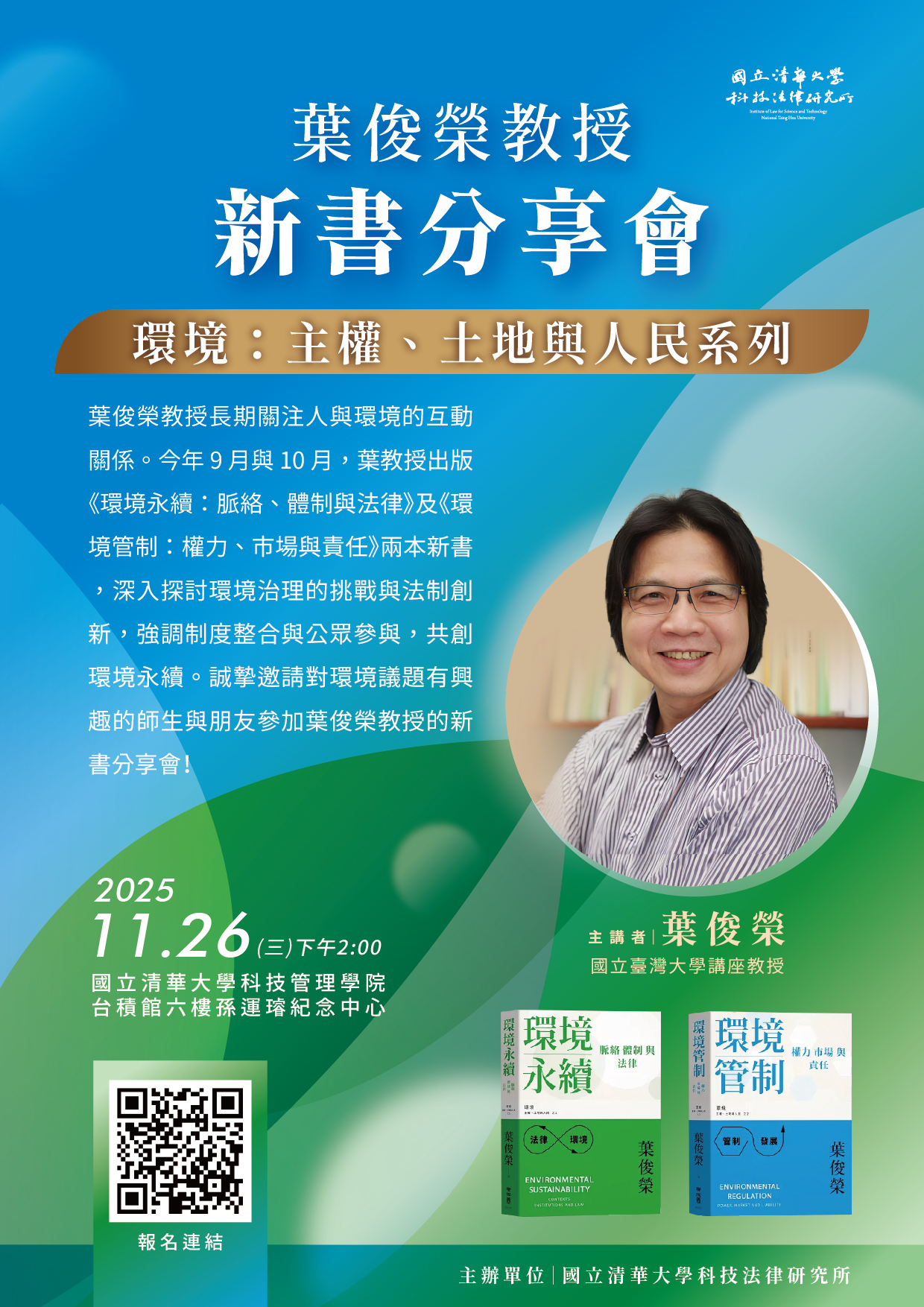 葉俊榮教授長期關注人與環境的互動關係。今年 9 月與 10 月,葉教授出版《環境永續:脈絡、體制與法律》及《環境管制:權力、市場與責任》兩本新書,深入探討環境治理的挑戰與法制創新,強調制度整合與公眾參與,共創環境永續。誠摯邀請對環境議題有興趣的師生與朋友參加葉俊榮教授的新書分享會!