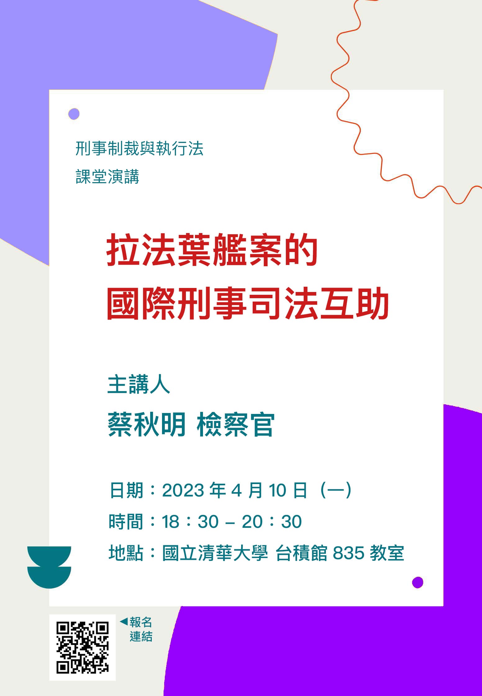 本演講為「刑事制裁及執行法專題」課程講座,邀請前法務部國際及兩岸法律司司長蔡秋明檢察官,以拉法葉艦案為核心,探討多年本案偵辦經驗,以及2016年刑法沒收新制修正施行後,本案單獨宣告沒收之執行及後續國際刑事司法互助。