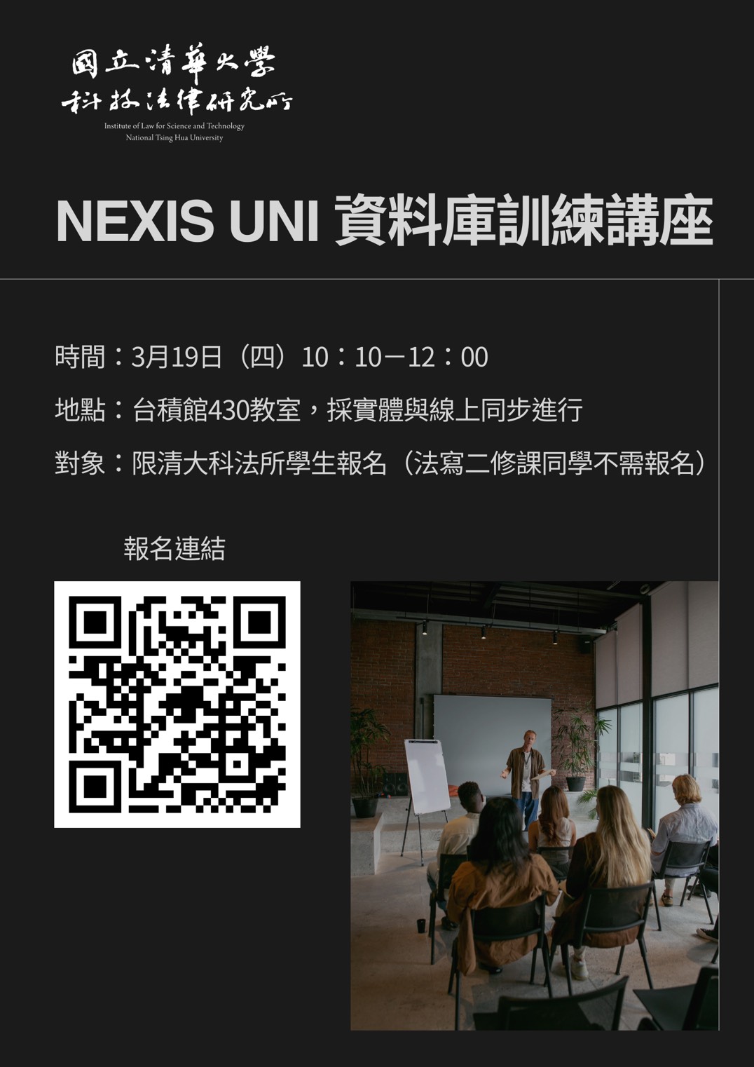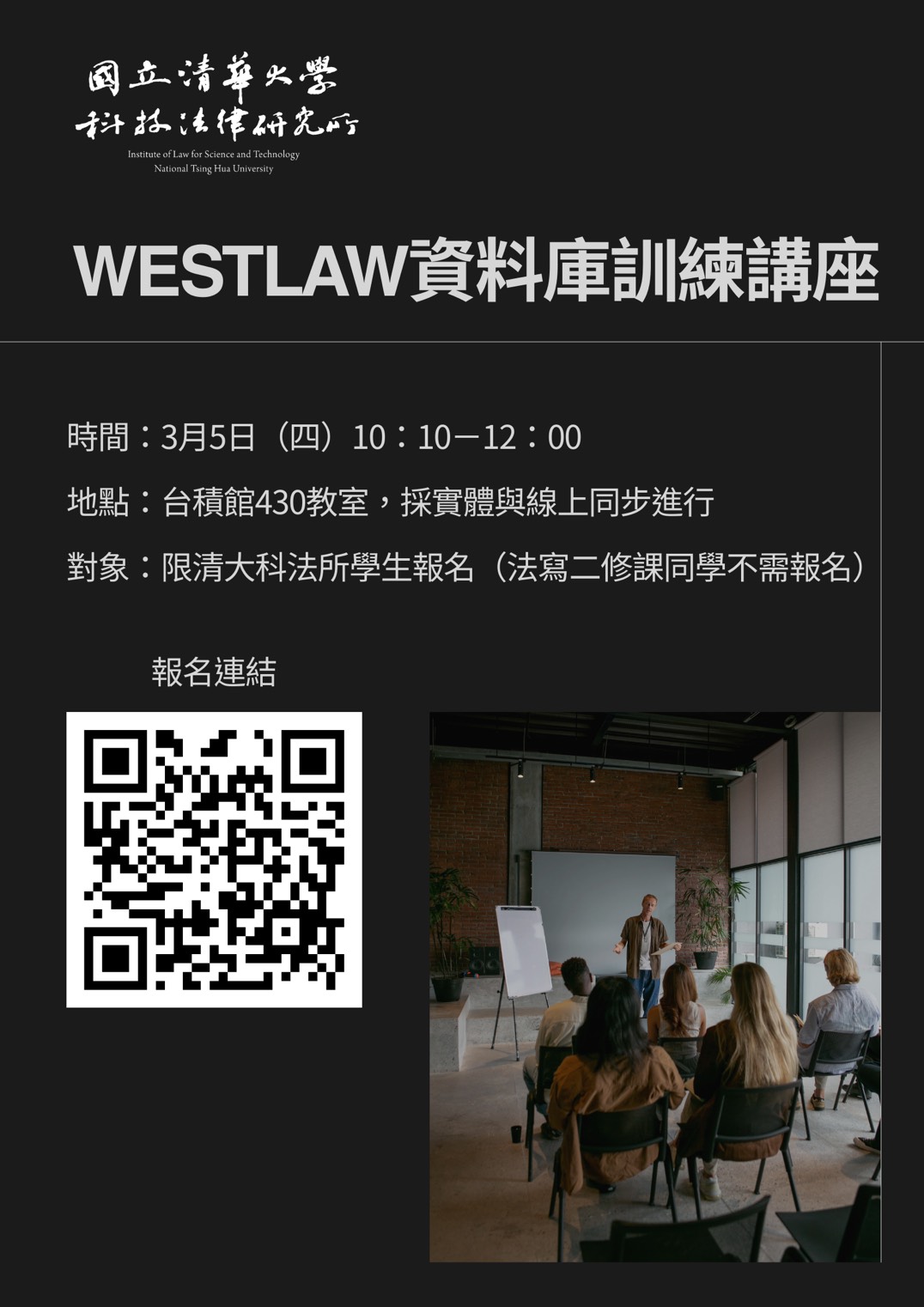 【對象】限清大科法所學生,法律寫作二的修課同學不需報名。