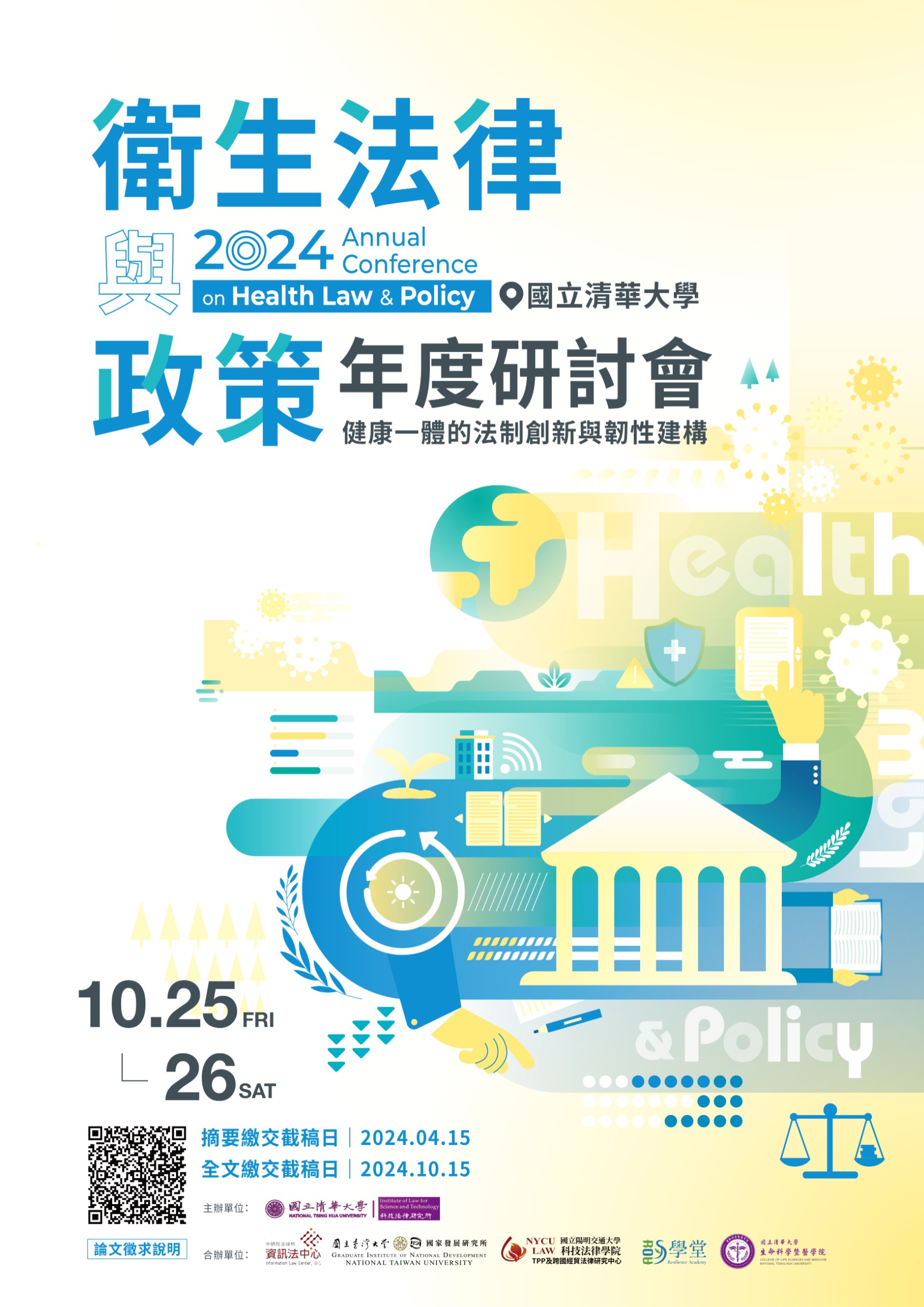 2024「衛生法律與政策年度研討會」將在2024年10月25至26日於國立清華大學舉辦。本年度研討會由國立清華大學科技法律研究所主辦,並由中央研究院法律學研究所資訊法中心、國立臺灣大學國家發展研究所、國立陽明交通大學科技法律學院TPP及跨國經貿法律研究中心、國立清華大學韌性研究中心與國立清華大學生命科學暨醫學院共同合辦。