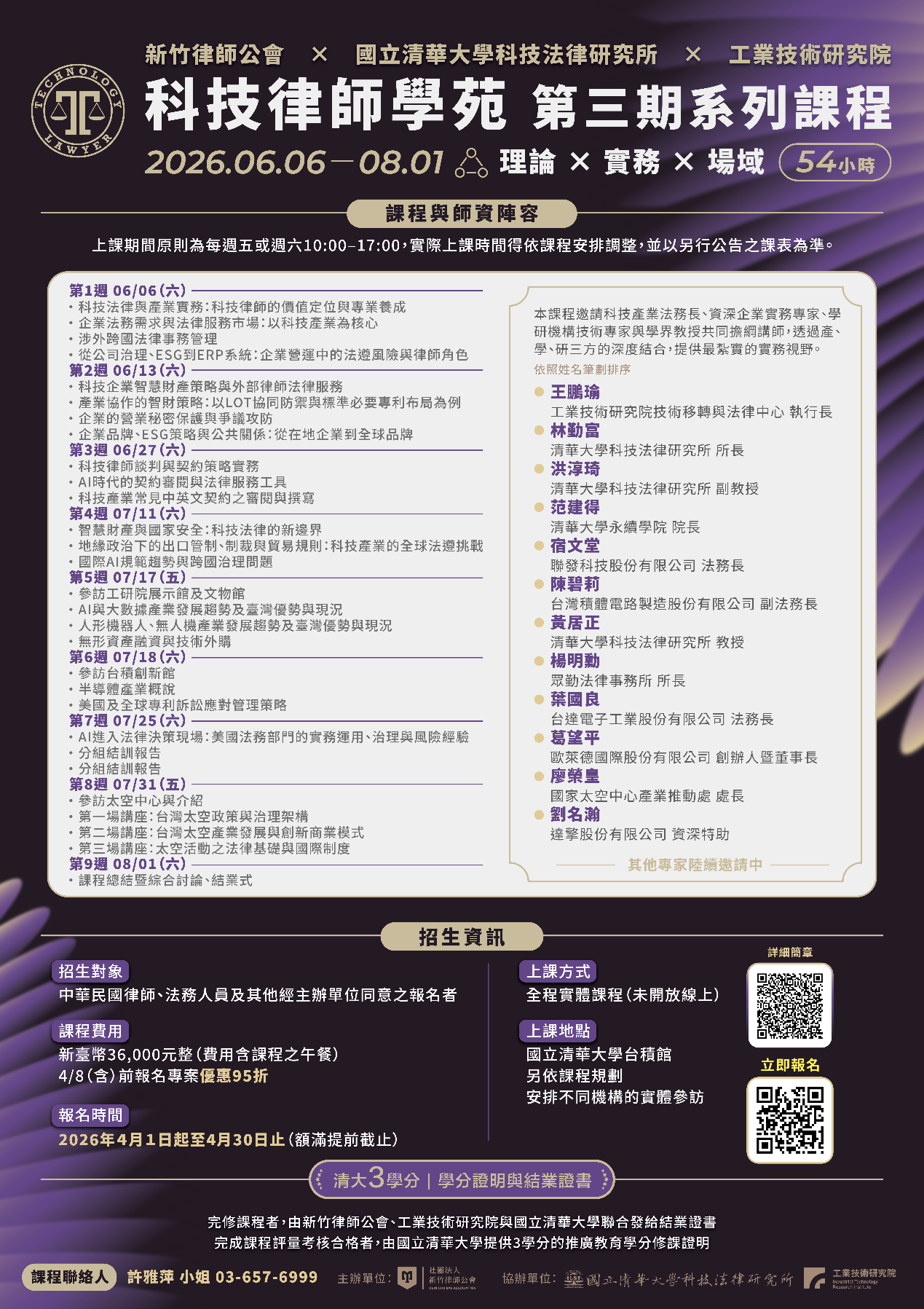 課程完成後,將由新竹律師公會、工業技術研究院與國立清華大學聯合發給結業證書。評量考核合格者,另由國立清華大學提供3學分的推廣教育學分修課證明。